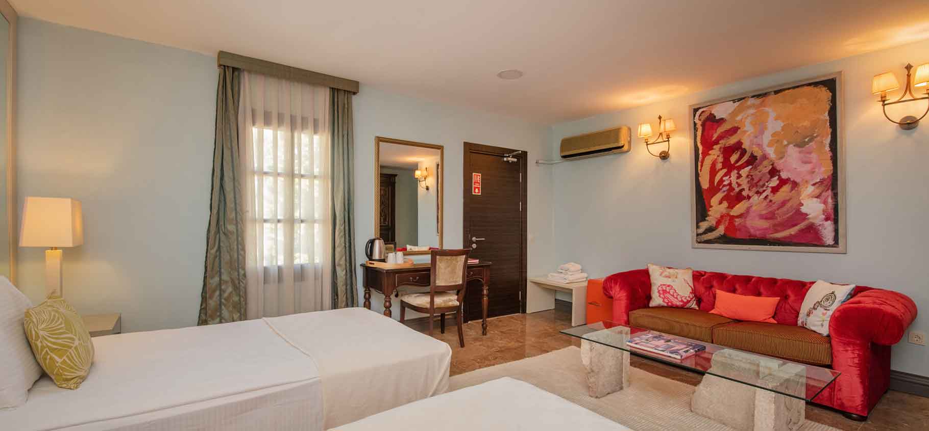 Oda Olanakları: bahçe manzarası, havuz havlusu, klima, gardırop, kanepe, oturma alanı, masa, yatak yanında priz, hipoalerjenik yastık, küçük balkon. 1 Banyo: odanın içinde özel.